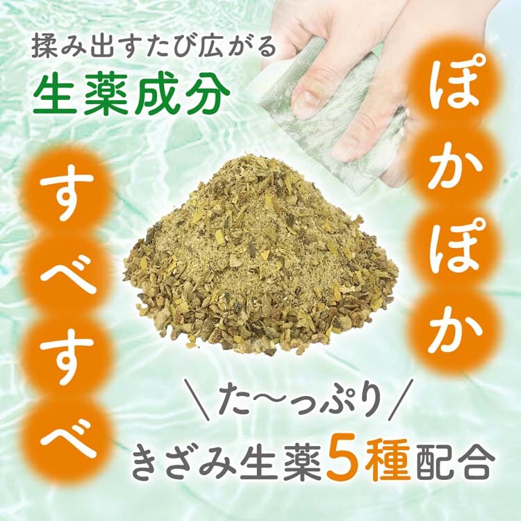 ●無機温泉成分である、炭酸水素ナトリウムに加え、温浴効果を高める生薬「トウキ」「センキュウ」「チンピ」「ショウキョウ」「オウバク」のきざみを配合しました。