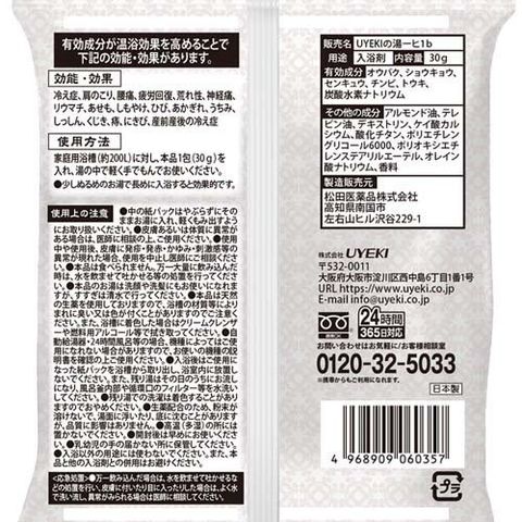 ・本品は天然の生薬を使用しておりますので、浴槽の材質等によりまれに臭い又は色が付くことがありますのでご注意ください。また、浴槽に着色した場合はクリームクレンザーや燃料用アルコール等で拭き取ってください。
