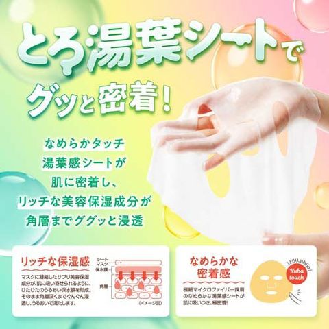 ●なめらかタッチ湯葉感シートが肌に密着し、美容保湿成分が角層までググっと浸透します。