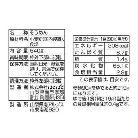 | 1食(90g)当たり エネルギー:308 kcal、たんぱく質:8.7 g、脂質:1.4 g、炭水化物:65.1 g、食塩相当量:2.9 g (この表示値は、目安です。) ・乾麺90gをゆでると約219gになります。ゆで後1食(約219g)当たりの食塩相当量は約0.4gです。 |