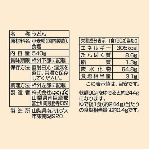 | 1食(90g)当たり エネルギー:305 kcal、たんぱく質:8.6 g、脂質:1.3 g、炭水化物:64.8 g、食塩相当量:3.1 g (この表示値は、目安です。) ・乾麺90gをゆでると約244gになります。ゆで後1食(約244g)当たりの食塩相当量は約0.4gです。 |