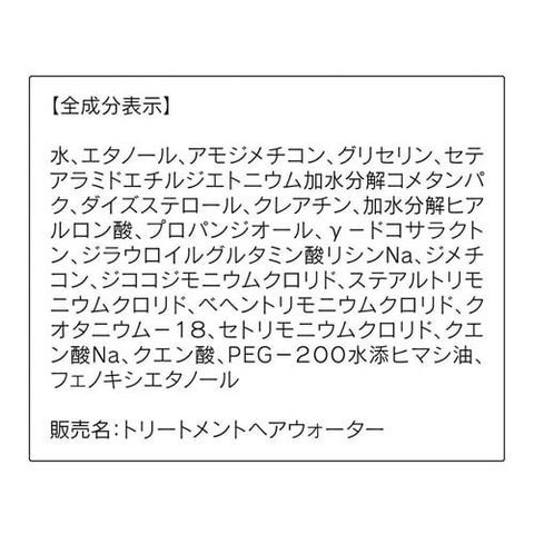 | 水、エタノール、アモジメチコン、グリセリン、セテアラミドエチルジエトニウム加水分解コメタンパク、ダイズステロール、クレアチン、加水分解ヒアルロン酸、プロパンジオール、γ-ドコサラクトン、ジラウロイルグルタミン酸リシンNa、ジメチコン、ジココジモニウムクロリド、ステアルトリモニウムクロリド、ベヘントリモニウムクロリド、クオタニウム-18、セトリモニウムクロリド、クエン酸Na、クエン酸、PEG-200水添ヒマシ油、フェノキシエタノール |