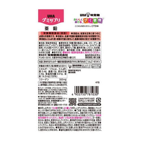 | 砂糖(国内製造)、水飴、コラーゲン、濃縮果汁(りんご、いちご)、亜鉛含有酵母/甘味料(ソルビトール、ステビア)、酸味料、ゲル化剤(ペクチン)、香料、環状オリゴ糖、着色料(紫ニンジン)、光沢剤、(一部にりんご・ゼラチンを含む) |
