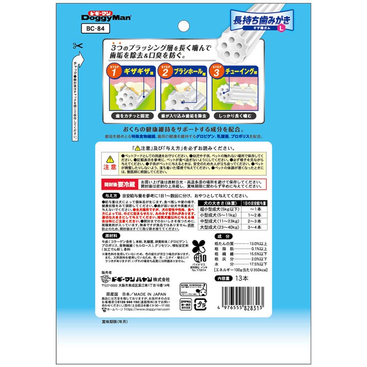 ●歯垢を絡めとる特殊食物繊維、歯周の健康を維持するグロビゲン、乳酸菌、プロポリスを配合。中型・大型犬向けサイズ。