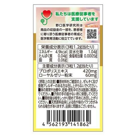 | (3粒1.2g当たり)エネルギー:4.9kcal、たんぱく質:0.04g、脂質:0.06g、炭水化物:1.04g、食塩相当量:0.0005g、プロポリスエキス:420mg、ローヤルゼリー粉末:60mg |