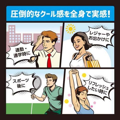 ・メントールの刺激に弱い方、アルコール過敏症の方や皮フの弱い方、乳幼児には使用しないでください。顔や髪、除毛直後の部位、粘膜付近への使用は避け、傷、はれもの、にきび、湿疹、かぶれ、やけど、日焼けによる熱傷など肌に異常のある部位には使用しないでください。吸入したり目に入ったりしないように注意してください。
