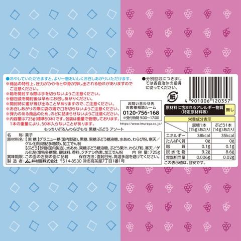 | ★黒糖:グラニュー糖(国内製造)、黒糖、果糖ぶどう糖液糖、水あめ、わらび粉、寒天/ゲル化剤(増粘多糖類)、加工でん粉 ★ぶどう:砂糖(国内製造)、水あめ、果糖ぶどう糖液糖、ぶどう果汁、わらび粉、寒天/ゲル化剤(増粘多糖類)、酸味料、香料、クチナシ色素、加工でん粉 |
