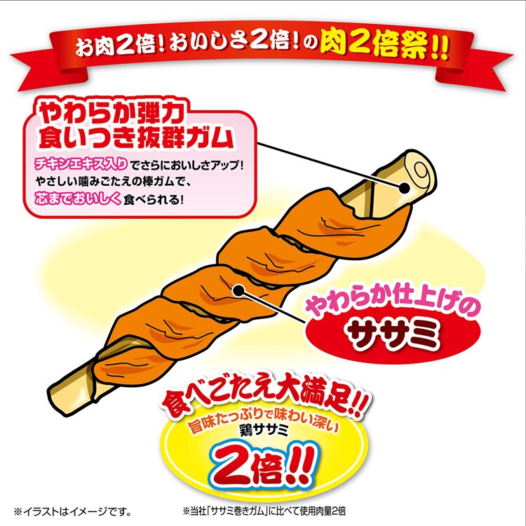 ●旨味たっぷりで味わい深い鶏ササミを2倍巻いた食べごたえ大満足のササミ巻きガム(メーカー「ササミ巻き ガム」比)。