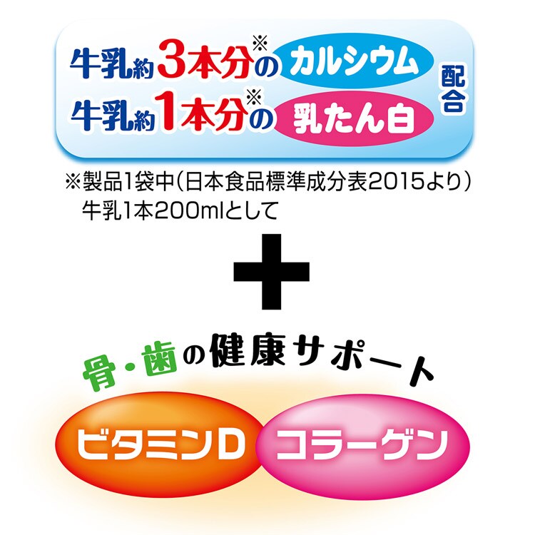 ●牛乳約3本分のカルシウムと牛乳約1本分の乳たん白にプラスして、骨・歯の健康サポートをするビタミンD・コラーゲン配合!