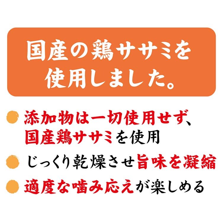 ●国産の鶏ササミをじっくり乾燥させることで旨味を凝縮し素材本来の味と適度な噛み応えが楽しめるよう仕上げました。