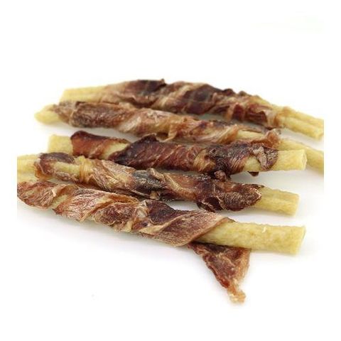 ●魚と鶏の軟骨が入った噛みごたえあるスティックに、濃厚なおいしさの赤いもも肉を巻きつけました。
