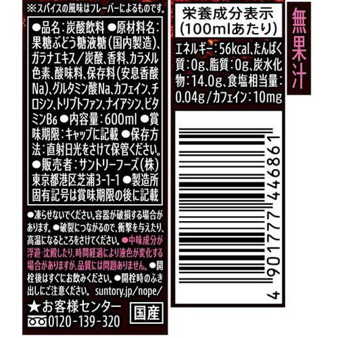 | 100mlあたり エネルギー:56kcal、たんぱく質:0g、脂質:0g、炭水化物:14.0g、食塩相当量:0.04/カフェイン:10mg |