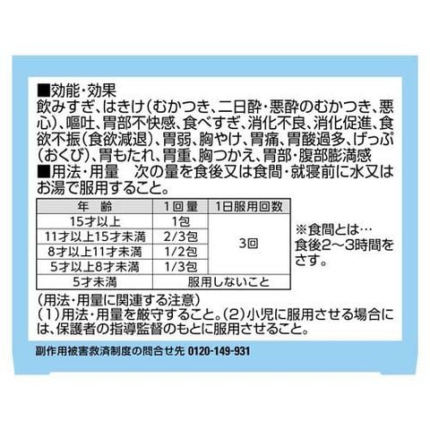 | ★有効成分(3包中) [有効成分と配合量] L-グルタミン(粘膜修復剤):405mg アルジオキサ(粘膜修復剤):150mg カンゾウ末(粘膜修復剤):225mg ケイヒ末(健胃剤):435mg ニンジン末(健胃剤):225mg 炭酸水素ナトリウム(制酸剤):1200mg 炭酸マグネシウム(制酸剤):690mg 沈降炭酸カルシウム(制酸剤):360mg メタケイ酸アルミン酸マグネシウム(制酸剤):240mg ロートエキス(制酸剤):30mg ビオヂアスターゼ2000(消化剤):90mg プロザイム6(消化剤):15mg リパーゼAP6(消化剤):60mg 添加物:ポビドン、アルギン酸ナトリウム、l-メントール、ハッカ油、D-マンニトール、ヒドロキシプロピルセルロース |