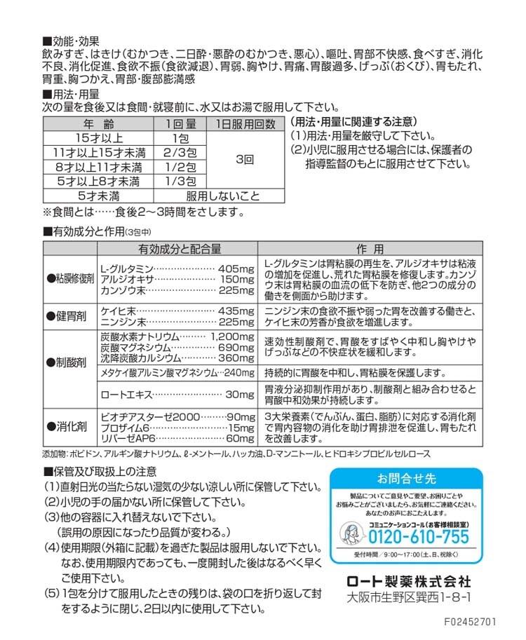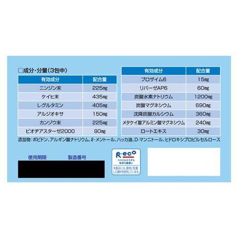 | ★有効成分(3包中) [有効成分と配合量] L-グルタミン(粘膜修復剤):405mg アルジオキサ(粘膜修復剤):150mg カンゾウ末(粘膜修復剤):225mg ケイヒ末(健胃剤):435mg ニンジン末(健胃剤):225mg 炭酸水素ナトリウム(制酸剤):1200mg 炭酸マグネシウム(制酸剤):690mg 沈降炭酸カルシウム(制酸剤):360mg メタケイ酸アルミン酸マグネシウム(制酸剤):240mg ロートエキス(制酸剤):30mg ビオヂアスターゼ2000(消化剤):90mg プロザイム6(消化剤):15mg リパーゼAP6(消化剤):60mg 添加物:ポビドン、アルギン酸ナトリウム、l-メントール、ハッカ油、D-マンニトール、ヒドロキシプロピルセルロース |