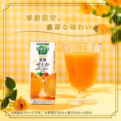 ●愛媛県産せとかの濃厚な甘みととろけるような口あたりに、ポンカンの甘くてやさしい香りが後からふわりと重なる、野菜・果実100%ミックスジュース。