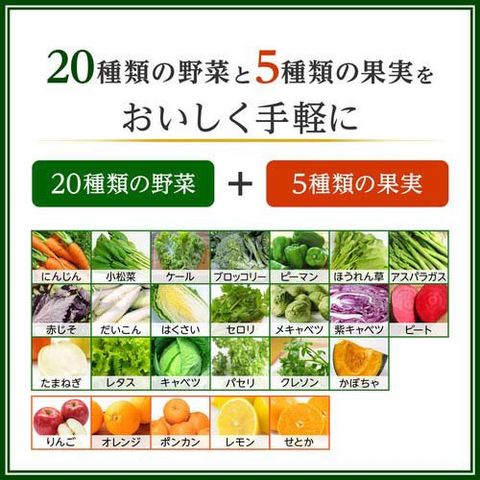 | 野菜(にんじん(輸入)、小松菜、ケール、ブロッコリー、ピーマン、ほうれん草、アスパラガス、赤じそ、だいこん、はくさい、セロリ、メキャベツ(プチヴェール)、紫キャベツ、ビート、たまねぎ、レタス、キャベツ、パセリ、クレソン、かぼちゃ)、果実(りんご、オレンジ、ポンカン(愛媛県産100%)、レモン、せとか(愛媛県産100%))/香料、ビタミンC、クエン酸 |