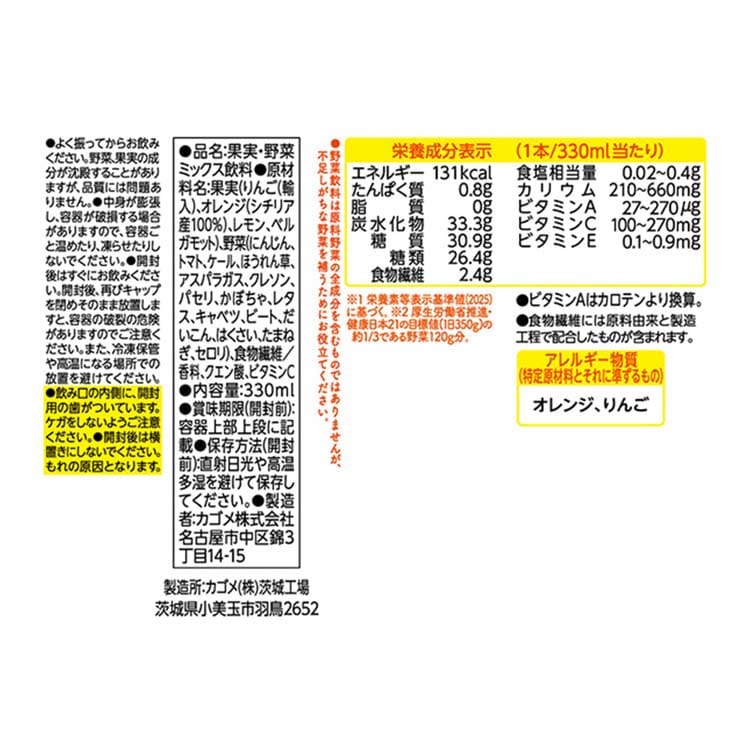 | 1本/330ml当たり エネルギー:131kcal、たんぱく質:0.8g、脂質:0g、炭水化物:33.3g(糖質:30.9g、糖類:26.4g、食物繊維:2.4g)、食塩相当量:0.02 ~0.4g、カリウム:210 ~660mg、ビタミンA:27 ~270μg、ビタミンC:100 ~270mg、ビタミンE:0.1 ~0.9mg |