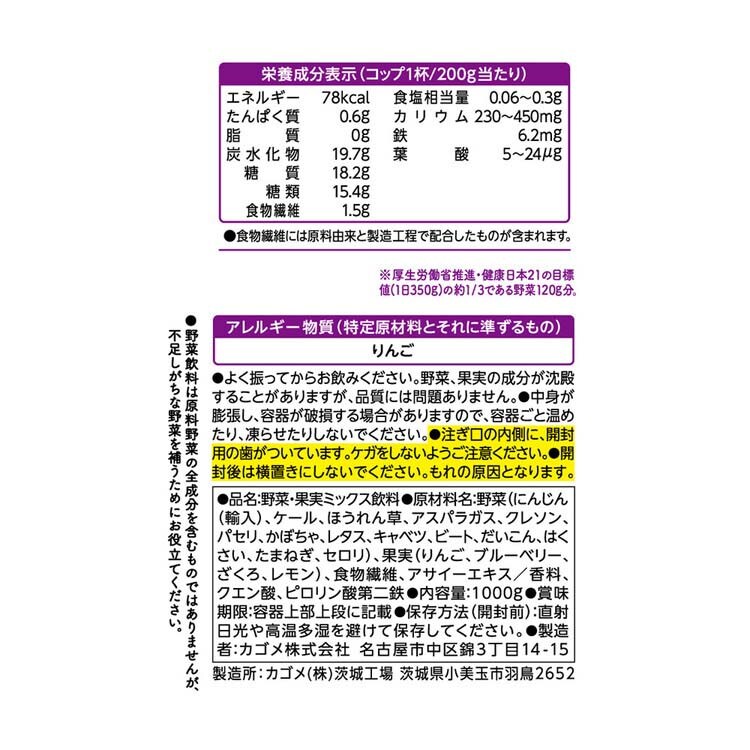 | 野菜(にんじん(輸入)、ケール、ほうれん草、アスパラガス、クレソン、パセリ、かぼちゃ、レタス、キャベツ、ビート、だいこん、はくさい、たまねぎ、セロリ)、果実(りんご、ブルーベリー、ざくろ、レモン)、食物繊維、アサイーエキス/香料、クエン酸、ピロリン酸第二鉄 |