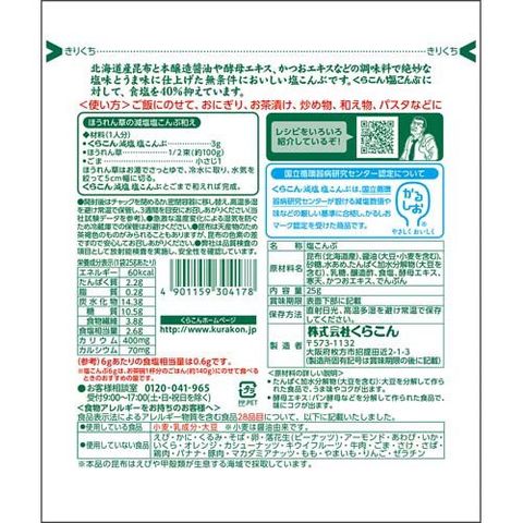 ●くらこん「塩こんぶ」に対して40%減塩しており、お子様から体に気を使いたい方まで幅広く安心して召しあがれる商品です。