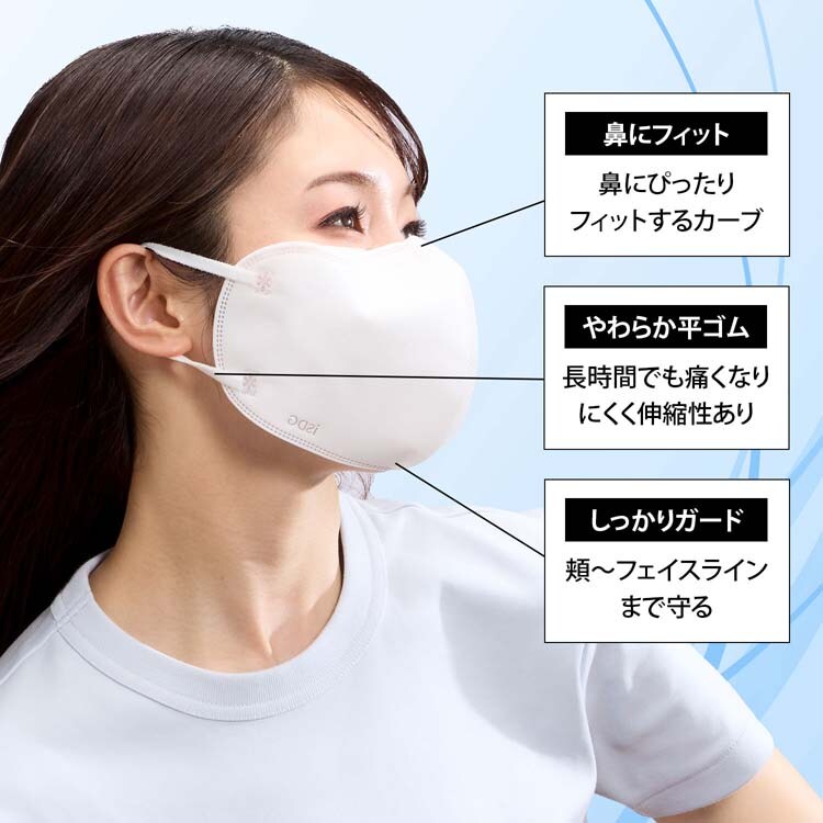 ・やわらかく、伸縮性の高い平ゴムを採用。長時間の着用時でも耳が痛くなりにくい。※