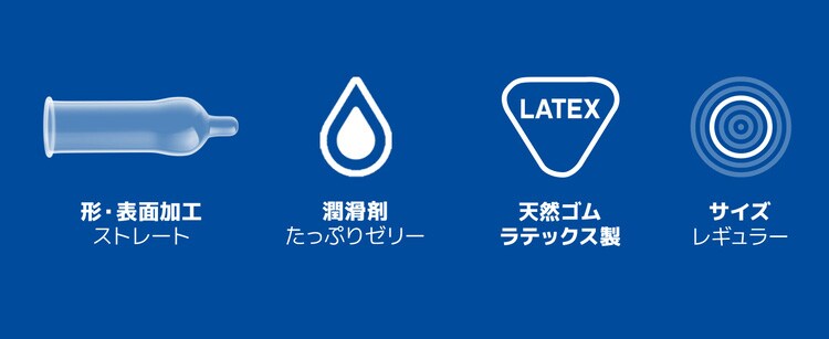 ●天然ゴムなので嫌なニオイもなし。簡単装着。レギュラーサイズ。たっぷりゼリー付きタイプ。