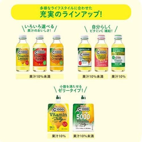 | 1瓶(140ml)当たり エネルギー:68kcal、たんぱく質:0g、脂質:0g、炭水化物:17g、食塩相当量:0.25g、ビタミンC:1000mg、ビタミンB1:0.15~0.54mg |