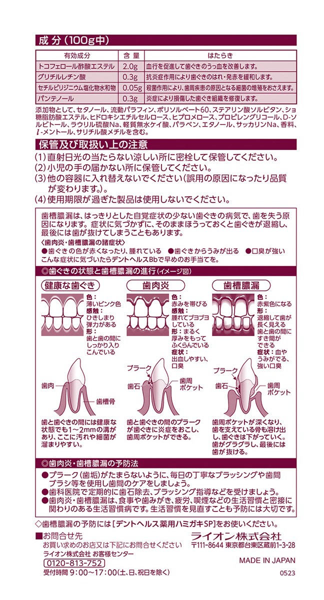 | 100g中 有効成分:含量:はたらき トコフェロール酢酸エステル:2.0g:血行を促進して歯ぐきのうっ血を改善します。 グリチルレチン酸:0.3g:抗炎症作用により歯ぐきのはれ・発赤を緩和します。 セチルピリジニウム塩化物水和物:0.05g:殺菌作用により、歯周疾患の原因となる細菌の増殖をおさえます。 パンテノール:0.3g:炎症により損傷した歯ぐき組織を修復します。 添加物として、セタノール、流動パラフィン、ポリソルベート60、ステアリン酸ソルビタン、ショ糖脂肪酸エステル、ヒドロキシエチルセルロース、ヒプロメロース、プロピレングリコール、D-ソルビトール、ラウリル硫酸Na、軽質無水ケイ酸、パラベン、エタノール、サッカリンNa、香料、l-メントール、サリチル酸メチルを含む。 |