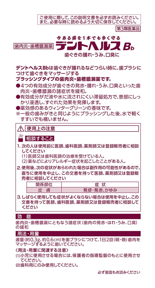 ●デントヘルスBbは歯ぐきが腫れるなどつらい時に、歯ブラシにつけて歯ぐきをマッサージするブラッシングタイプの歯肉炎・歯槽膿漏薬です。