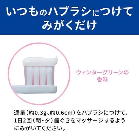 適量(約0.3g、約0.6cm)を歯ブラシにつけて、1日2回(朝・晩)歯肉をマッサージするように磨いてください。
