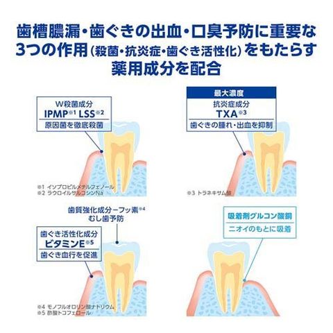 | 口臭の防止、口中を爽快にする、歯槽膿漏の予防、歯肉炎の予防、出血を防ぐ、ムシ歯の発生及び進行の予防、歯を白くする、口中を浄化する |