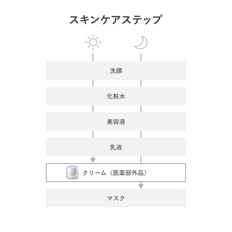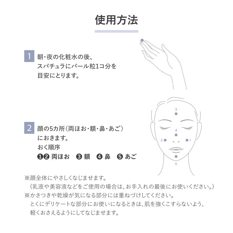 ・朝・夜の化粧水の後、スパチュラにパール粒1コ分を目安にとり、顔全体にやさしくなじませます。(乳液や美容液などをご使用の場合は、お手入れの最後にお使いください。)