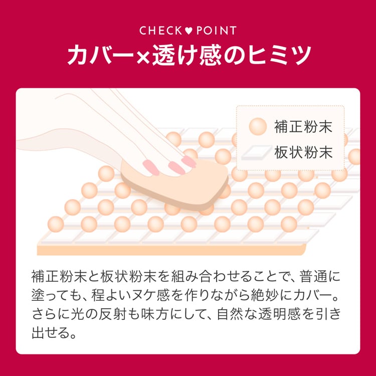 ●スポンジをすべらせるだけで、気になる毛穴・色ムラ・ニキビ跡をさっとカバーするのに、厚塗り感なし。
