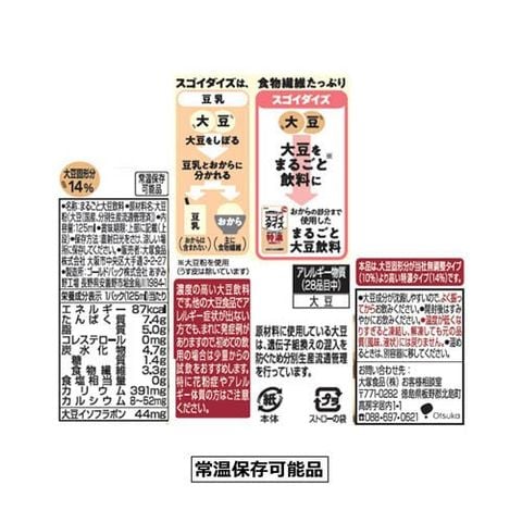 | 1パック(125ml)当たり エネルギー:87kcal、たんぱく質:7.4g、脂質:5.0g、コレステロール:0mg、炭水化物:4.7g、糖質:1.4g、食物繊維:3.3g、食塩相当量:0g、ナトリウム:391mg、カルシウム:8~52mg、大豆イソフラボン:44mg、大豆固形分:14% |