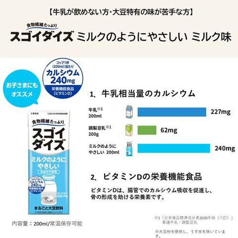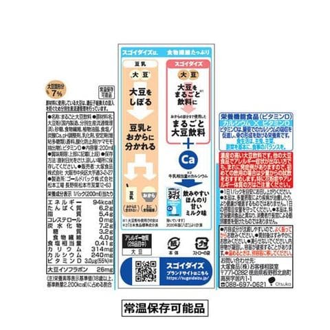 | 1パック(200ml)当たり エネルギー:94kcal、たんぱく質:6.2g、脂質:5.4g、コレステロール:0mg、炭水化物:7.2g、糖質:3.2g、食物繊維:4.0g、食塩相当量:0.41g、カリウム:314mg、カルシウム:240mg、ビタミンD:3.0μg(55%)(注)、大豆イソフラボン:26mg、大豆固形分:7%(注)栄養素等表示基準値(18歳以上、基準熱量2.200kcal)に占める割合 |