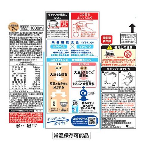 | 1パック(200ml)当たり エネルギー:94kcal、たんぱく質:6.2g、脂質:5.4g、コレステロール:0mg、炭水化物:7.2g、糖質:3.2g、食物繊維:4.0g、食塩相当量:0.41g、カリウム:314mg、カルシウム:240mg、ビタミンD:3.0μg(55%)(注)、大豆イソフラボン:26mg、大豆固形分:7%(注)栄養素等表示基準値(18歳以上、基準熱量2.200kcal)に占める割合 |