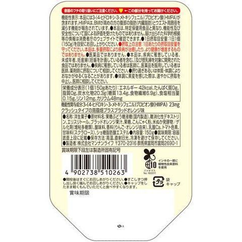 ●機能性関与成分3-(4-ヒドロキシ-3-メトキシフェニル)プロピオン酸(HMPA)配合のクラッシュタイプの蒟蒻畑です。