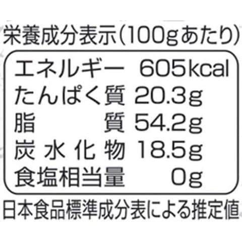 | 100gあたり エネルギー:605kcal、たんぱく質:20.3g、脂質:54.2g、炭水化物:18.5g、食塩相当量:0g |