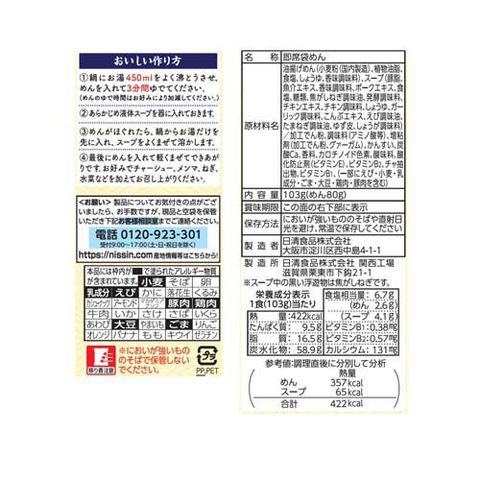 | 油揚げめん(小麦粉(国内製造)、植物油脂、食塩、しょうゆ、香味調味料)、スープ(豚脂、魚介エキス、香味調味料、ポークエキス、食塩、糖類、焦がしねぎ調味油、発酵調味料、チキンエキス、チキン調味料、しょうゆ、ガーリック調味料、こんぶエキス、えび調味油、たまねぎ調味油、ゆず皮、しょうが調味料)/加工でん粉、調味料(アミノ酸等)、増粘剤(加工でん粉、グァーガム)、かんすい、炭酸Ca、香料、カロチノイド色素、酸味料、酸化防止剤(ビタミンE)、ビタミンB2、チャ抽出物、ビタミンB1、(一部にえび・小麦・乳成分・ごま・大豆・鶏肉・豚肉を含む) |