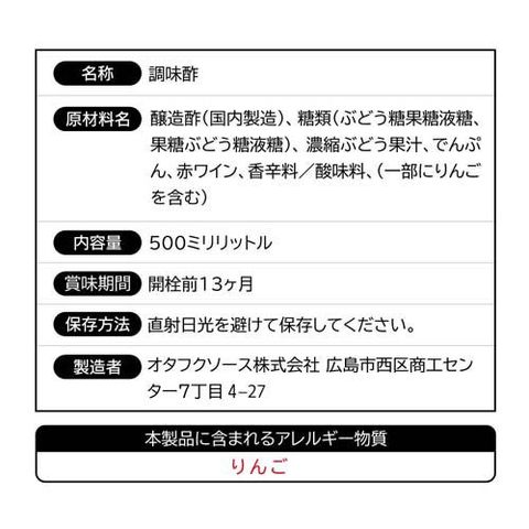 | 醸造酢(国内製造)、糖類(ぶどう糖果糖液糖、果糖ぶどう糖液糖)、濃縮ぶどう果汁、でんぷん、赤ワイン、香辛料/酸味料、(一部にりんごを含む) |