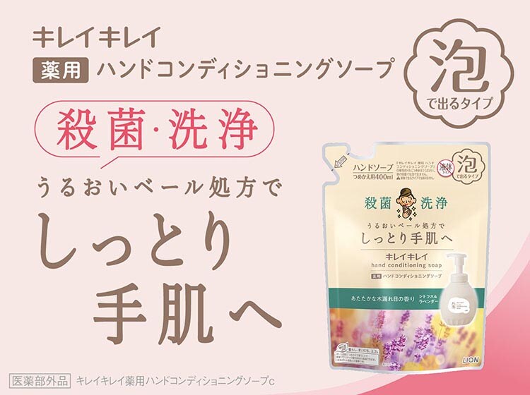 ●きちんと殺菌してバイ菌から手肌を守りながら、「うるおいベール」が手洗い後も手肌にとどまる、泡タイプのキレイキレイ薬用ハンドコンディショニングソープ。