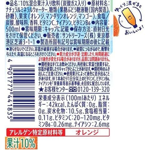 | ナチュラルミネラルウォーター、糖類(果糖ぶどう糖液糖(国内製造)、砂糖)、果実(オレンジ、マンダリンオレンジ、マンゴー)、食塩/炭酸、酸味料、香料、ビタミンC、ナイアシン、ビタミンB6 |