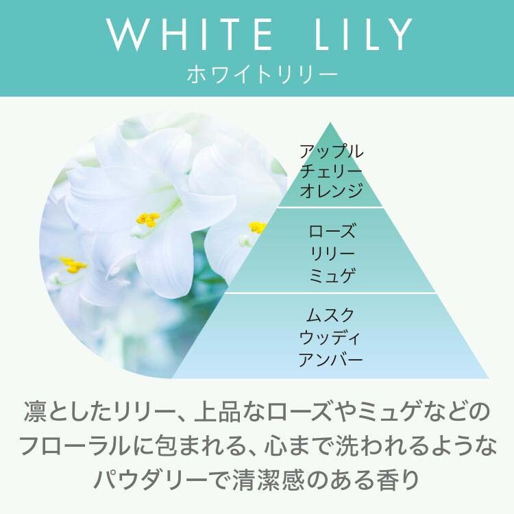 ●香り:凛としたリリーや、上品なローズ、ミュゲなどのフローラルに包まれた、心まで洗われるようなパウダリーで清潔感のある香り。