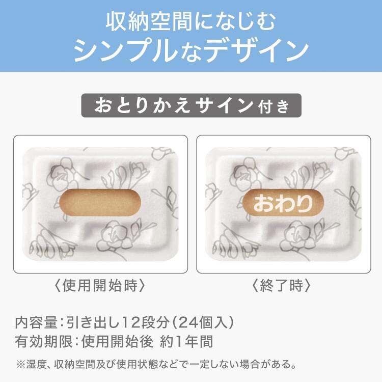 ・袋から取り出し、引き出しや衣装ケースの衣類の一番上に、おとりかえサインの窓を上にして置いてください。