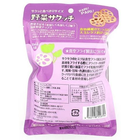 ●国産の蓮根をスライスし、こめ油を使用し真空フライ製法で揚げ、チップスにしました。