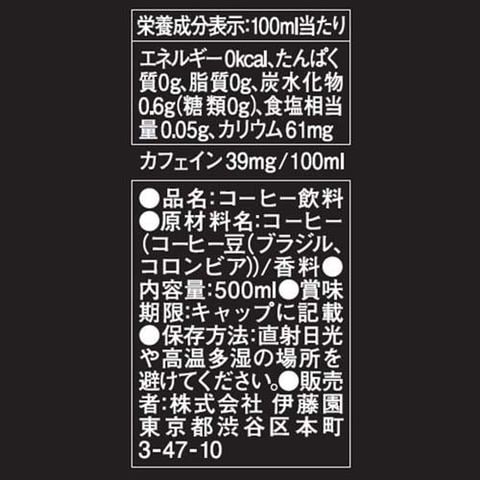 | 100mlあたり エネルギー:0kcal、たんぱく質:0g、脂質:0g、炭水化物:0.6g(糖類:0g)、食塩相当量:0.05g、カリウム:61mg、カフェイン:39mg |