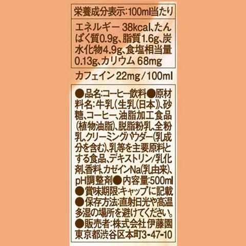 | 牛乳(生乳(日本))、砂糖、コーヒー、油脂加工食品(植物油脂)、脱脂粉乳、全粉乳、クリーミングパウダー(乳成分を含む)、乳等を主要原料とする食品、デキストリン/乳化剤、香料、カゼインNa(乳由来)、pH調整剤 |