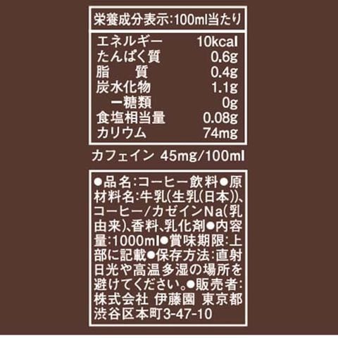 | 100mlあたり エネルギー:10kcal、たんぱく質:0.6g、脂質:0.4g、炭水化物:1.1g(糖類:0g)、食塩相当量:0.08g、カリウム:74mg、カフェイン:45mg |