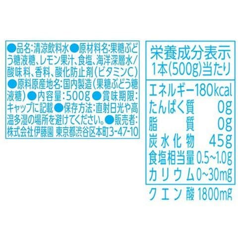 | 1本(500g)当たり エネルギー:180kcal、たんぱく質:0g、脂質:0g、炭水化物:45g、食塩相当量:0.5~1.0mg、カリウム:0~30mg、クエン酸:1800mg |
