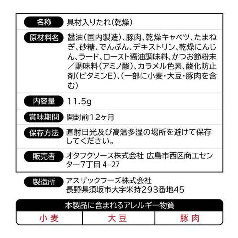 | 醤油(国内製造)、豚肉、乾燥キャベツ、たまねぎ、砂糖、でんぷん、デキストリン、乾燥にんじん、ラード、ロースト醤油調味料、かつお節粉末/調味料(アミノ酸)、カラメル色素、酸化防止剤(ビタミンE)、(一部に小麦・大豆・豚肉を含む) |
