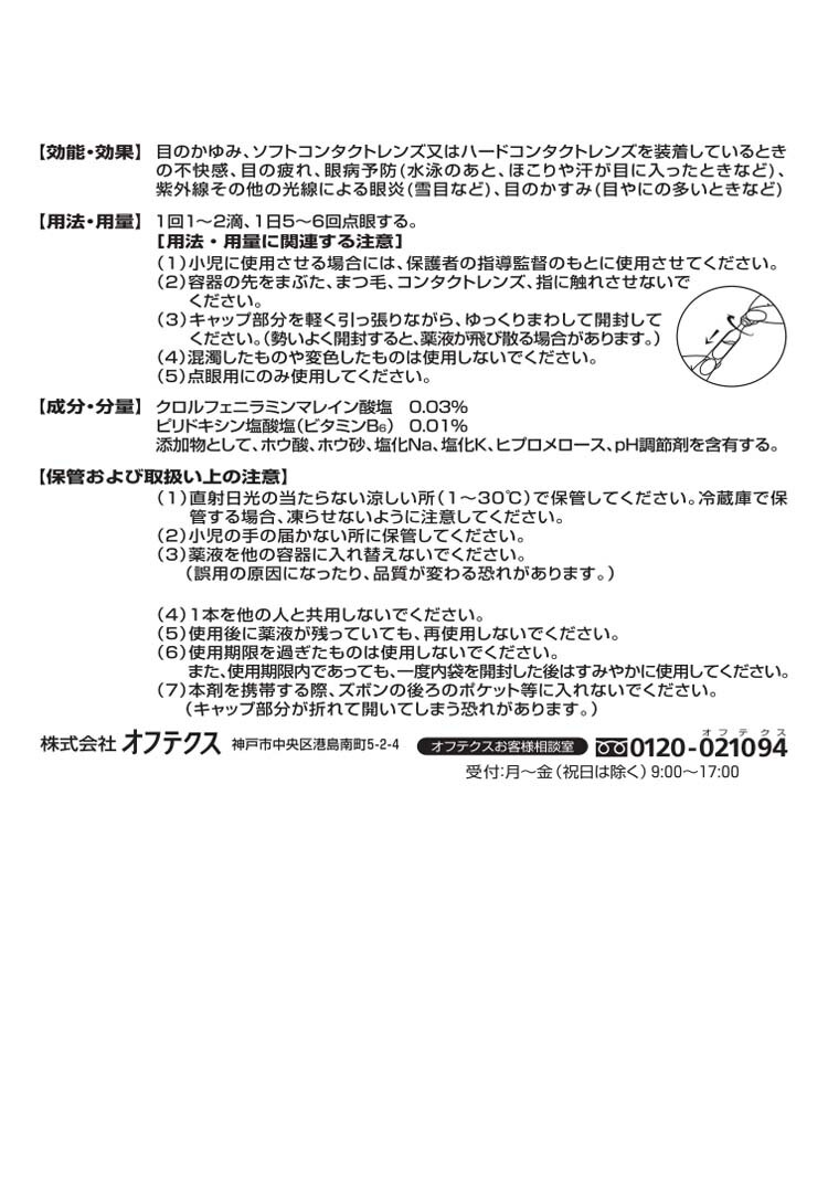 | 目のかゆみ、ソフトコンタクトレンズ又はハードコンタクトレンズを装着しているときの不快感、目の疲れ、眼病予防(水泳のあと、ほこりや汗が目に入ったときなど)、紫外線その他の光線による眼炎(雪目など)、目のかすみ(目やにの多いときなど) |